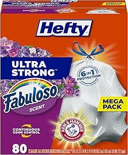 About this item 13 Gallon Tall Kitchen Garbage Bags-This package contains 80 Hefty Ultra Strong 13 Gallon Kitchen Trash Bags in White, Fabuloso scent Toughness You Can Trust-Hefty’s strongest tall kitchen garbage bags deliver toughness you can trust with a secure, break-resistant drawstring and superior durability Arm and Hammer Odor Control and Fabuloso Scent-Patented odor control, paired with the joyful scent of Fabuloso, leverages the power of Arm and Hammer to fight nasty odors and keep your kitchen smelling fresh 6-In-1 Protection-These Hefty 13 gallon trash bags offer a powerful combination of six features: flex strength, tough drawstring, patented odor control, and resistance to leaks, punctures, and rips Arm and Hammer Odor Control and Fabuloso Scent-Patented odor control, paired with the joyful scent of Fabuloso, leverages the power of Arm and Hammer to fight nasty odors and keep your kitchen smelling fresh › See more product details